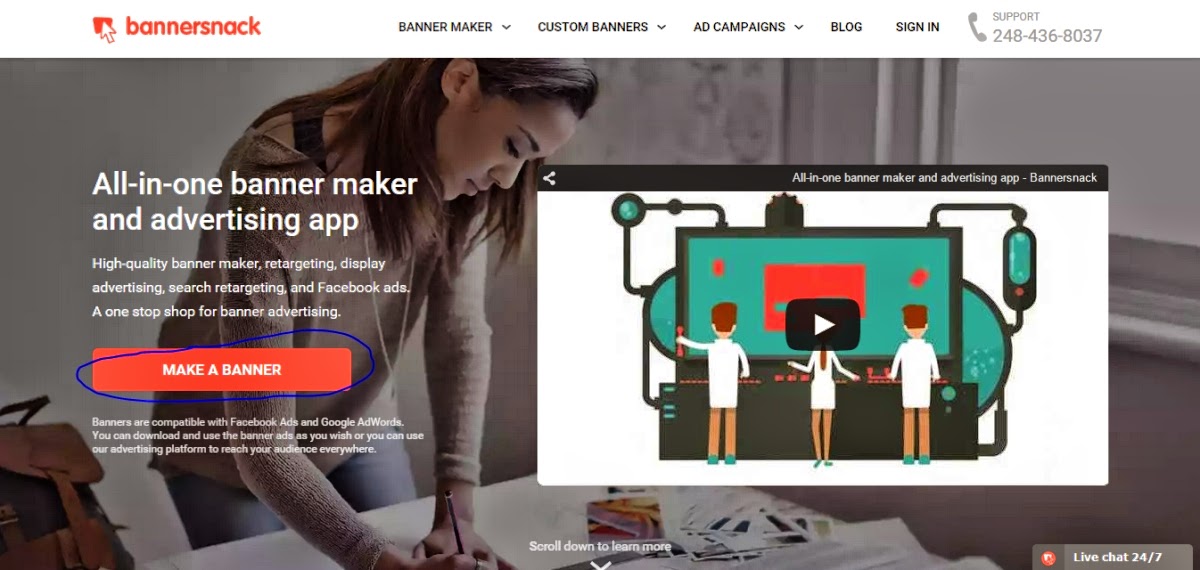 فقط سوف تذهب الى كلمة MAKE A BANNER كما هو موضح فى الصورة و تقوم بالضغط عليها و سوف تتوجه الى صفحة اخرى للتسجيل يوجد اكثر من خيار تسجيل اذا كنت تريد التسجيل بالبريد او بالفيس بوك او تويتر او جوجل بلس و بعد اختيار طريقة تسجيلك للموقع سوف تنتقل تلقائى الى صفحة اخرى يوجد بها الكثير من التصميمات سوف تختار مقاس التصميم بتصميم المفضل الذى اعجبك و تقوم بالضغط عليه كما انه سوف يعطيك خيار و هو انك تريد تصميم (PNG / JPG) او Animated / Interactive (GIF / SWF / HTML5) اختر ما تريده و قم بوضع العلامة عليه و اضغط على التصميم الذى اعجبك و بعدها سوف تنتقل الى صفحة اخرى سوف يكون بها الاعلان سوف تشاهدة العديد من الادوات امامك مثل اضافة فيديو او تعديل الكلام او تغير الصور ان الموقع سهل للغاية بعد الانتهاء سوف تقوم بالضغط على حفظ للذهاب الى التصميم او كود الاعلان الذى انتهيت منه . ( موقع bannersnack ) .