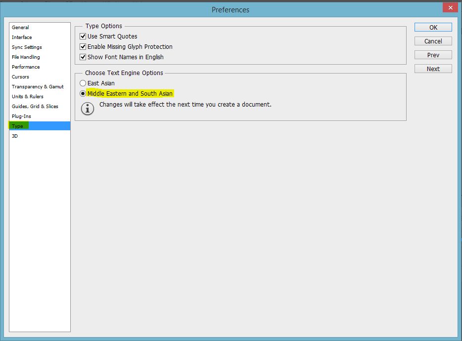 سوف تظهر صفحة كما فى الصورة التى فى الاعلى فى القائمة الجانية سوف تختار خيار Type كما موضح فى الصورة و عبدها اختيار Middle eastem and south asian و بعد الانتهاء سوف تقوم بالضغط على ok و اغلاق الفوتوشوب بشكل كامل و اعادة تشغيله مرة اخرى و تجربة الكتابة سوف تعمل بشكل طبيعى يمكنك ايضاً مشاهدة الشرح فيديو .